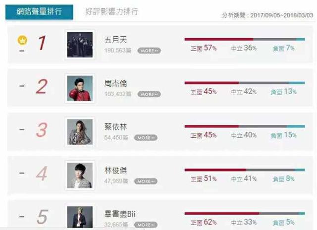 在內(nèi)地?zé)o人能及的周杰倫,在臺(tái)灣竟然比不過五月天。從報(bào)道數(shù)量到正面新聞,都遠(yuǎn)遠(yuǎn)比不上五月天。而在內(nèi)地早已經(jīng)沒有太大影響力的蔡依林竟然也超過了林俊杰,占據(jù)第三名的位置,不過正面新聞遠(yuǎn)遠(yuǎn)不如林俊杰。第五名的畢書盡更是完全沒有在內(nèi)地發(fā)展,幾乎算是查無此人了。